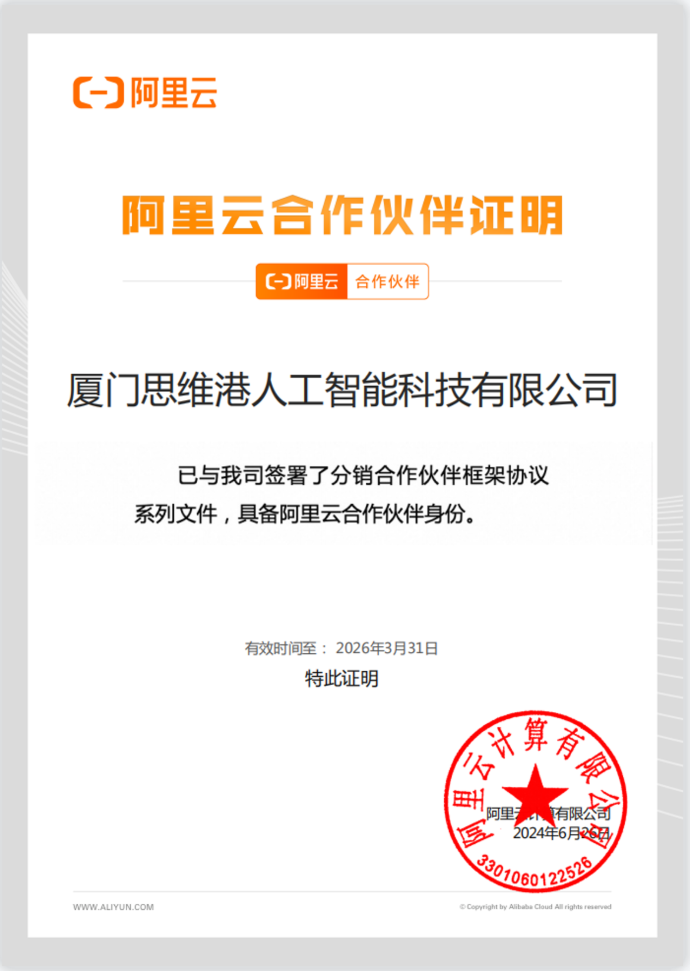 思维港已正式成为阿里云的合作伙伴。这一资质不仅是对我们技术实力和服务质量的认可,更是我们为客户提供卓越云计算服务的坚实基础。作为阿里云的合作伙伴,我们享有以下优势: