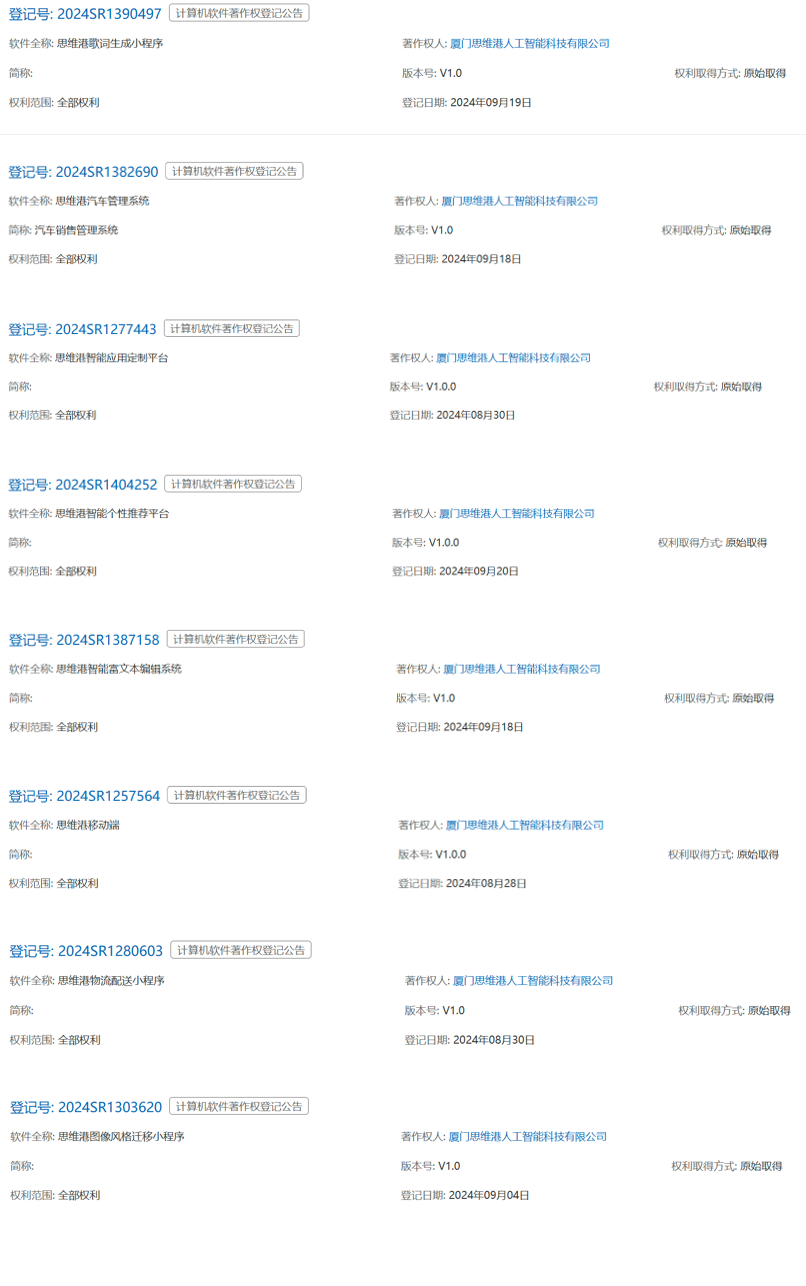 我们的软件著作权涵盖了多个领域,包括但不限于思维港智能应用定制平台、思维港移动端、思维港汽车管理系统、思维港图像风格迁移程序......